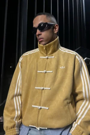 Adidas-Inspired Mustard Yellow Chinese Collar Jacket – Premium Velvet Streetwear with Stripe Sleeves