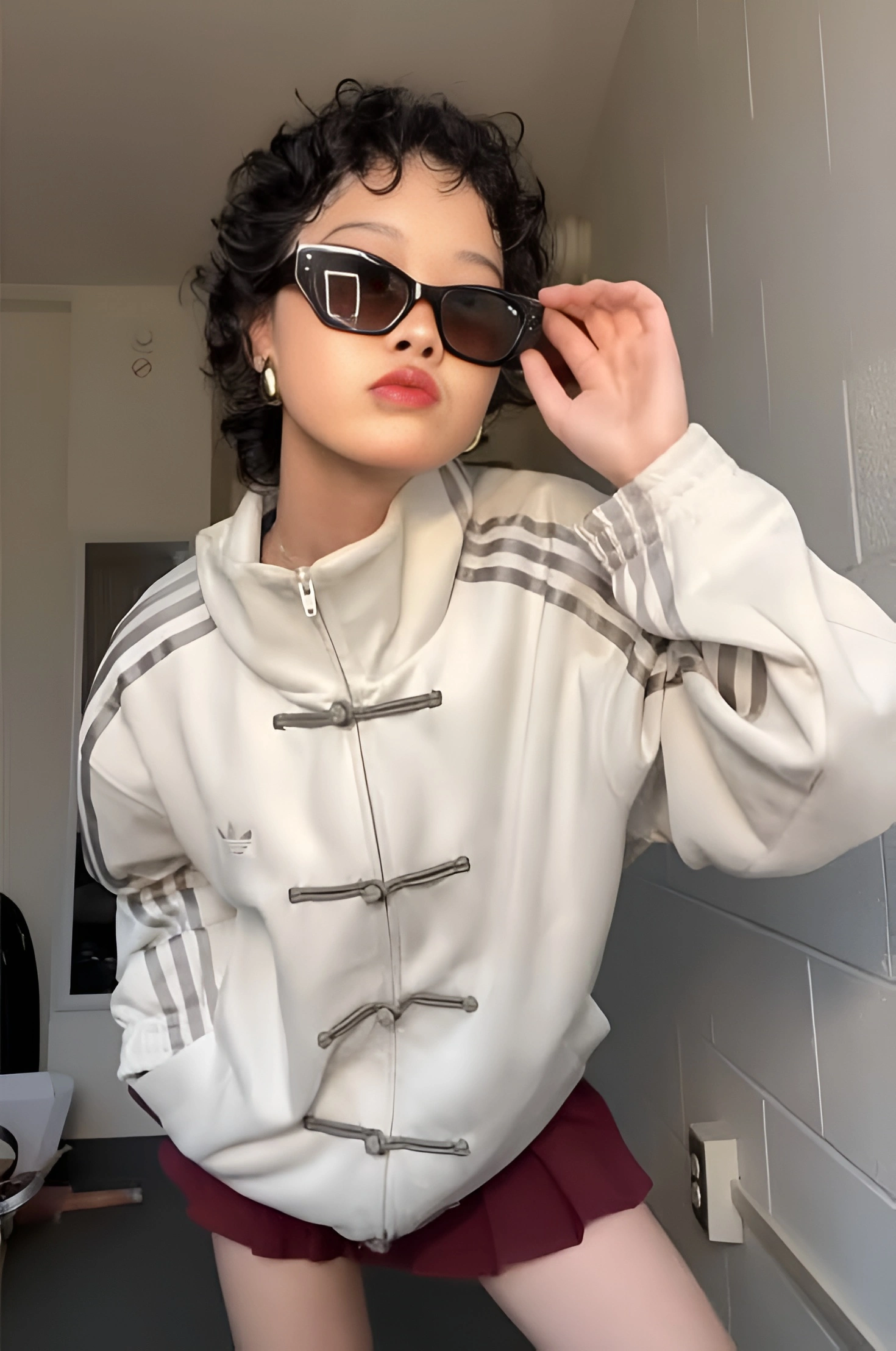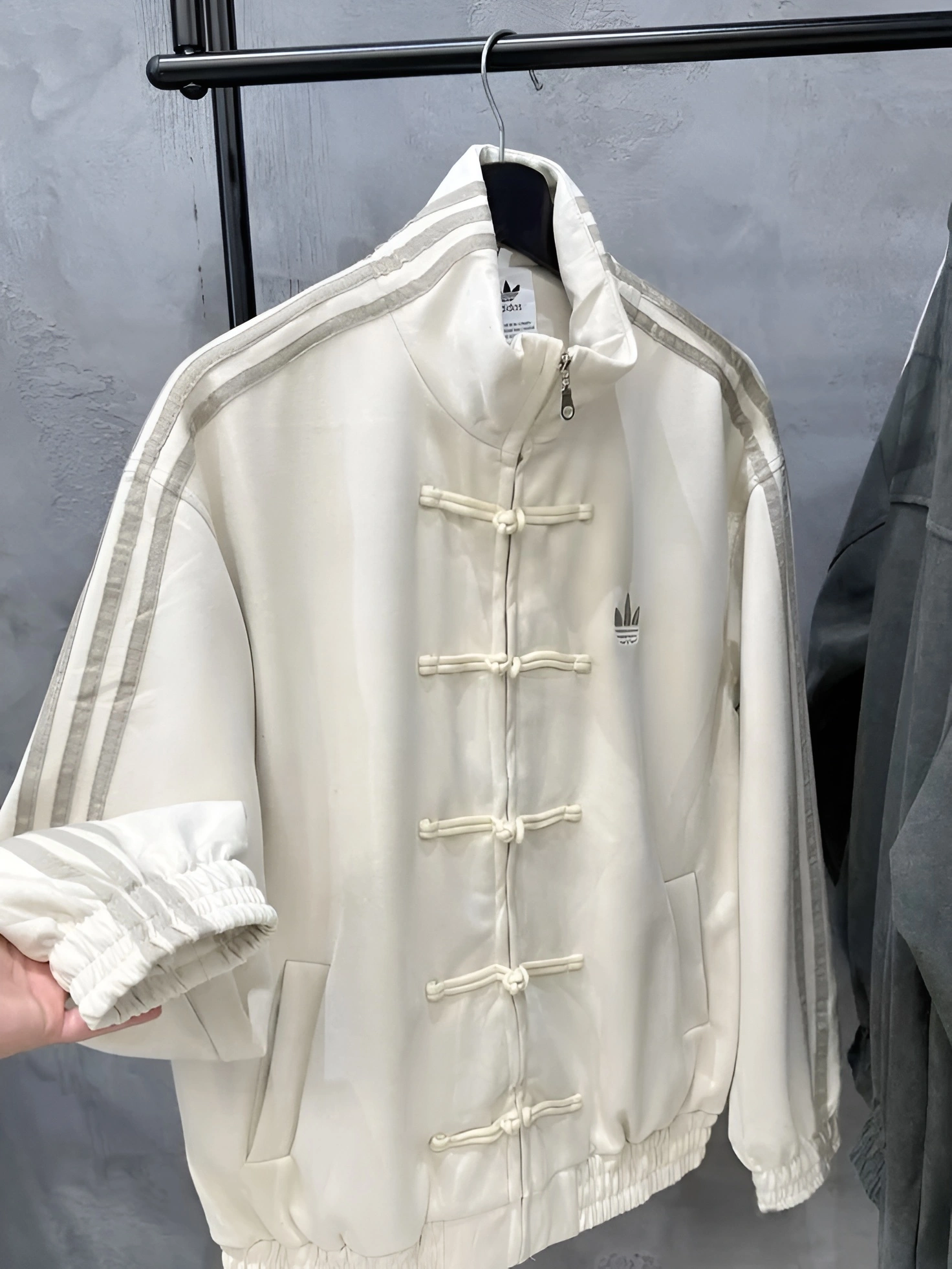 The standout feature is the Chinese knot button detailing, giving this Adidas jacket a unique fusion of traditional inspiration and contemporary street fashion. Combined with the iconic Adidas triple stripes and logo, this piece becomes a must-have for trend lovers.