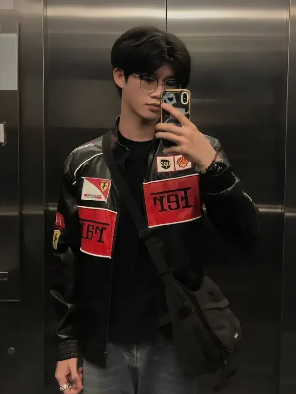 Add sunglasses & crossbody bag for influencer-style outfits Ferrari jacket, Ferrari F1 jacket, racing jacket men, biker leather jacket, black red leather jacket, motorsport jacket, streetwear jacket India, faux leather jacket men, F1 racing jacket