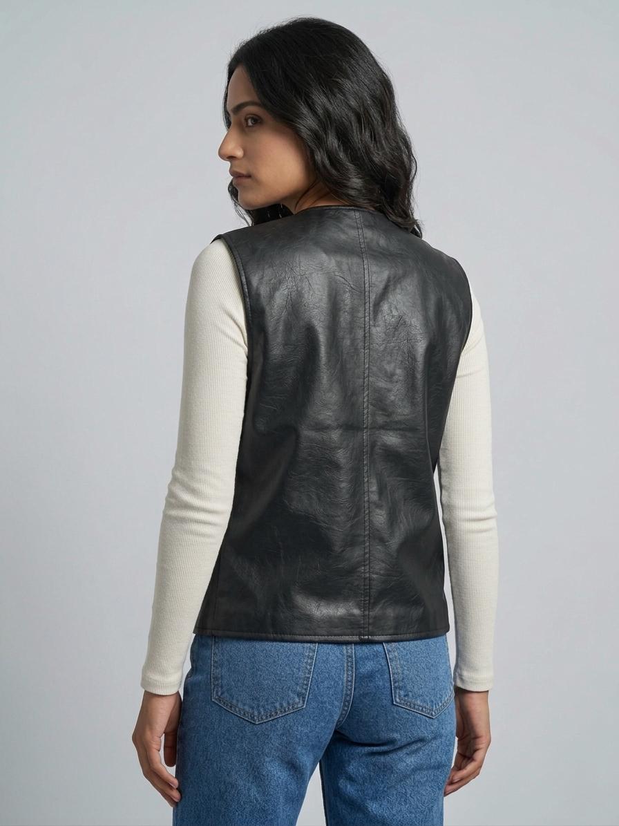 Step into bold, modern fashion with this Women’s Black Leather Utility Vest, designed for style, comfort, and everyday functionality. Crafted from high-quality leather (rexine), this vest features a rich textured finish with visible grain and natural wrinkles, giving it a premium and realistic leather look.