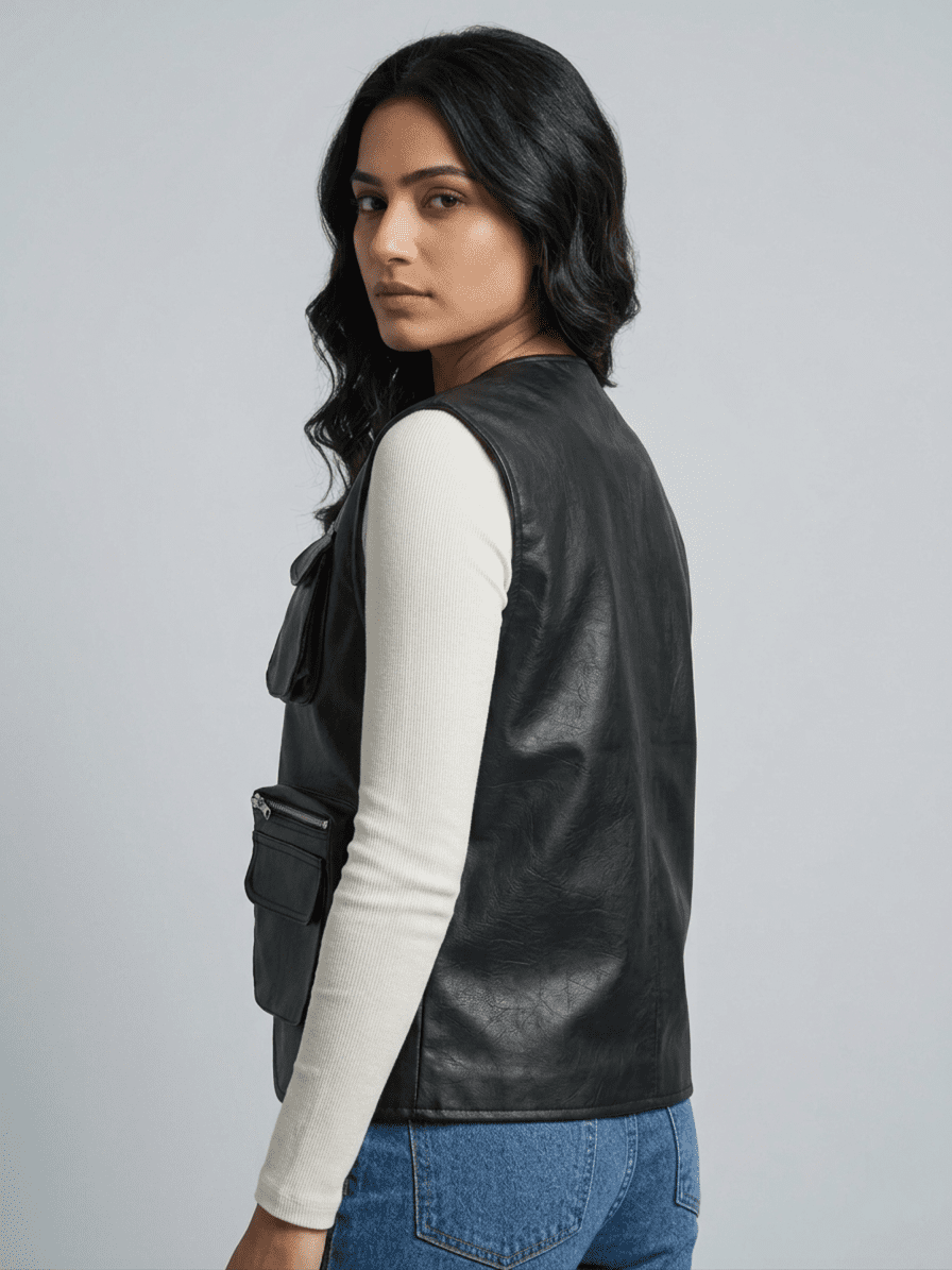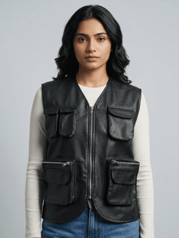 women leather vest, black leather vest women, utility vest women, cargo vest women, streetwear vest women, multi pocket vest women, stylish vest for women, leather vest India, fashion vest women, trendy women vest